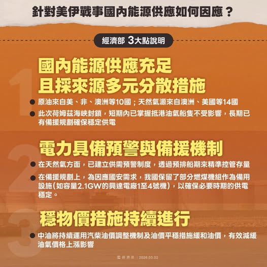 (一)完成3-4月天然氣船調度 經濟部:全力穩定供電及物價以降低中東戰爭影響(115.3.10)