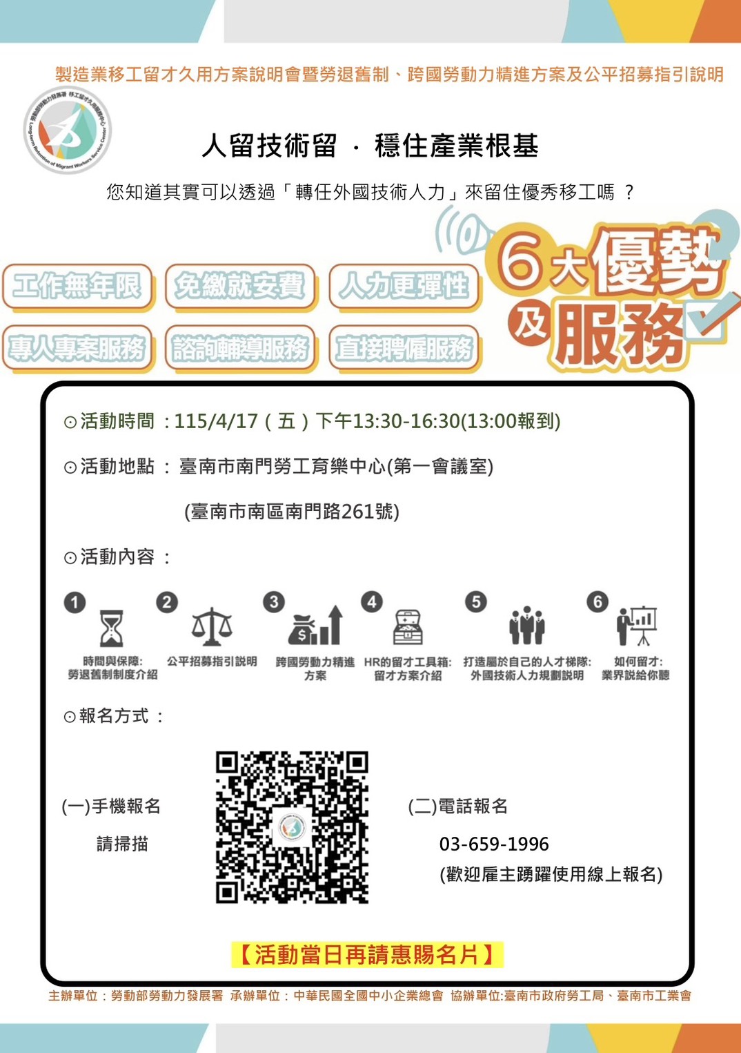 歡迎大家踴躍報名參加線上/實體說明會,亦可致電「移工留才久用服務中心」03-6591996報名,或透過以下網址報名: